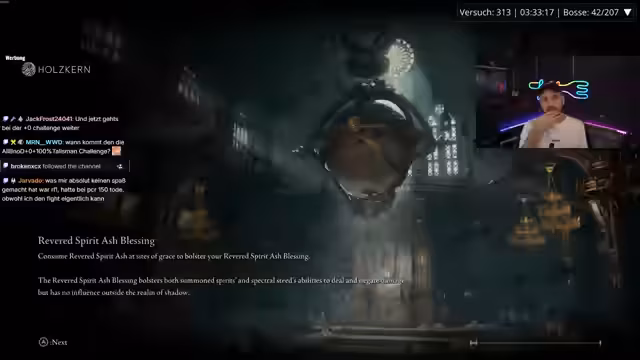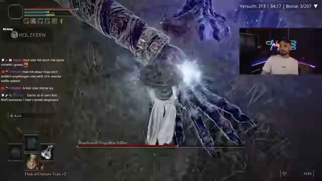 01:54:02Der Streamer äußert Bedenken bezüglich Gideon, der als Problemgegner identifiziert wird. Ein weiteres kleines Problem ist der Mangel an Geld, was die Möglichkeit einschränkt, das Leben zu verbessern. Es wird betont, dass die Challenge auch ohne die drei 'Supergegner' (Deathblood Lion, Lamenta, Gargoyles) extrem schwer ist. Der Streamer beschreibt den Kampf gegen einen bestimmten Gegner als frustrierend und qualvoll, da er kaum Treffer landen kann und der Gegner ihn mit einer 'True Combo' tötet. Es wird die Notwendigkeit hervorgehoben, alle schweren Bosse früh im Spiel zu haben, auch wenn dies schmerzhaft ist. Der 'Sunflower'-Boss wird als 'bestes Limgrave aller Zeiten' bezeichnet, da er früh besiegt werden kann. Es wird erwähnt, dass der Rekord bei 170 Versuchen lag, bevor ein One-Shot-Tod im DLC erfolgte. Die 'All Be No Die +0'-Challenge wird als viel schwieriger als der 'U-Weg' beschrieben, da keine Waffen gelevelt werden dürfen und das Verlassen der Arena nicht erlaubt ist.