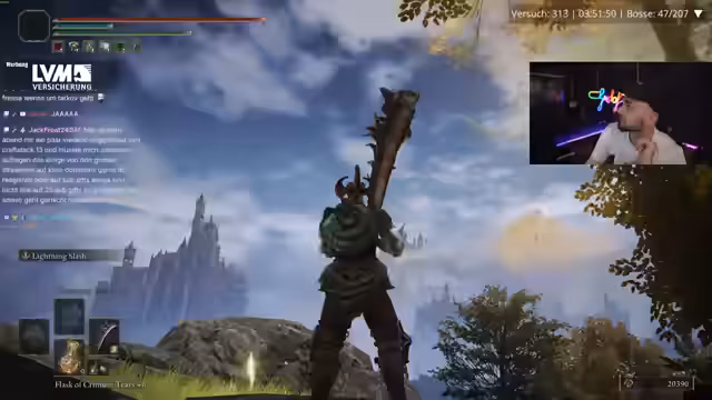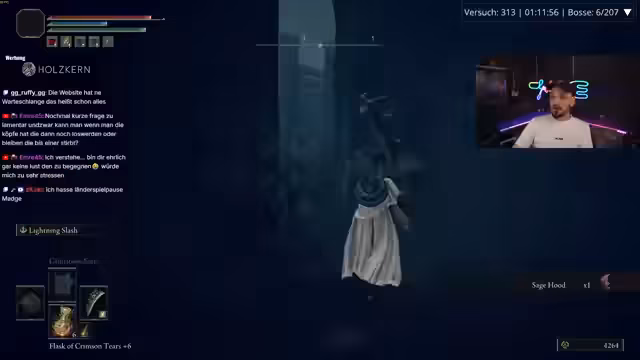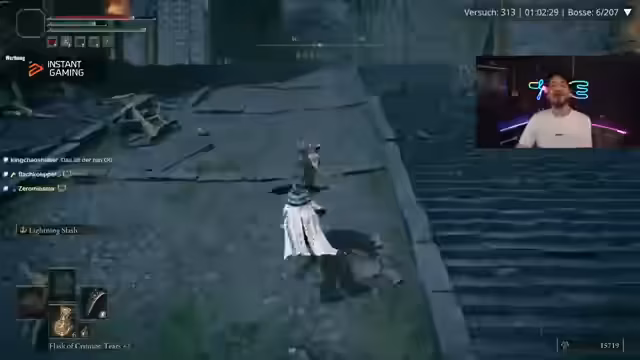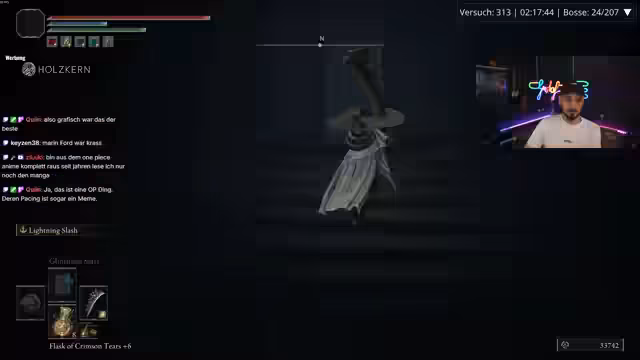 01:02:11Nachdem der Streamer bereits oft an bestimmten Stellen gestorben ist, wird die Heilung für das aktuelle Gebiet als ausreichend empfunden. Die Entdeckung von 'Lightning Slash' wird als entscheidend für den Schaden im Spiel gefeiert, da es eine der wenigen Möglichkeiten ist, effektiv Schaden zu verursachen. Nun fehlt nur noch eine passende Waffe, um 'Limgrave' erfolgreich zu durchspielen. Der Controller 'Razer Wolverine V3 Pro' wird weiterhin als gut befunden, trotz seiner Schwächen. Es wird betont, dass 'Lightning Slash' auf alle Waffen angewendet werden kann, was es zu einer vielseitigen Option macht. Die Suche nach Geld und 'Remembrance' zur Verdopplung von Gegenständen wird fortgesetzt, da dies für den weiteren Verlauf des Spiels sehr hilfreich wäre. Das Lichtkaufen wird als nützlich erachtet, um weniger zu sterben. Viele gefundene Gegenstände werden verkauft, da sie im aktuellen 'Plus 0'-Run nicht benötigt werden und Geld für das Aufleveln von Stärke benötigt wird, um die gewünschte Waffe nutzen zu können.