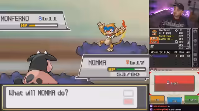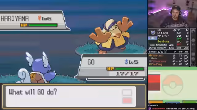 01:17:07Es wird eine Ironmon Challenge gespielt, bei der nur ein einziges Pokémon zum Kämpfen verwendet wird. Ein zweites Pokémon, 'Pity', dient lediglich als VM-Hure, da dem Hauptpokémon keine VMs beigebracht werden dürfen. Alle Gegner sind 50% höher im Level, und alles ist randomisiert, was die Challenge extrem schwer macht. In Feuerrot wurde diese Challenge nach 1200 Versuchen geschafft, aber in dieser Edition gab es bereits Tode in der siebten Arena. Heatwift dominiert mit Sonnenstrahlen und verstärkten Feuerattacken. Die Pokémon haben zufällige Statuswerte, die sich aber am Base-Stat-Total orientieren. Starke Pokémon bleiben also im Verhältnis stark. Attacken und Fähigkeiten sind komplett zufällig. Es gibt Pokémon, die keine neuen Attacken lernen, und die vorhandenen Attacken sind zufällig. Wetten werden von den Mods entgegengenommen. Es wird überlegt, ob Typen auch randomisiert werden sollen, was die Challenge aber noch schwerer machen würde.