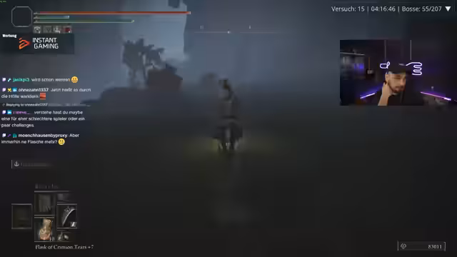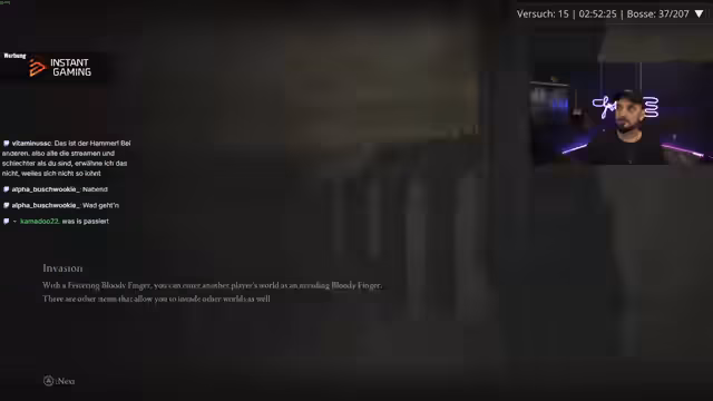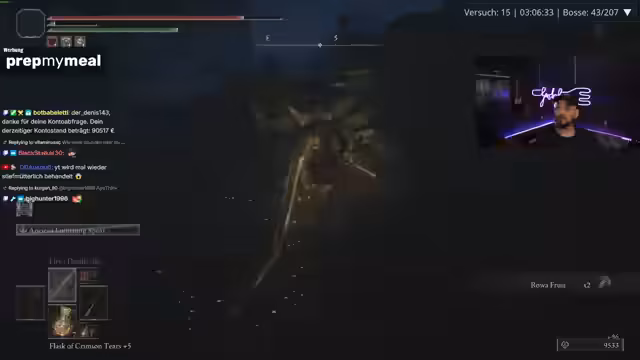 02:14:42Es wird über die geringen Werbeeinnahmen auf Twitch gesprochen, die bei etwa 300 Euro im Monat liegen und nicht ausreichen, um davon zu leben. Der Spieler erklärt, dass er einen größeren Anteil erhält, wenn er die Werbung selbst schaltet, anstatt Twitch dies zu überlassen. Es wird erwähnt, dass größere Streamer wie „Dinos“ mit drei Minuten Werbung pro Stunde deutlich höhere Einnahmen erzielen. Der Wunsch, keine Werbung schalten zu müssen, um die Zuschauer nicht zu stören, wird geäußert, aber es wird auch anerkannt, dass Werbung ein Grund für Abonnements ist. Die „French Challenge“ wird erklärt: eine Herausforderung, bei der alle Bosse besiegt werden müssen, ohne zu sterben, wobei die aufgesammelten Gegenstände automatisch ausgerüstet werden. Es wird die Freude über das Finden eines wichtigen Talismans mit 20% mehr Verteidigung und die Möglichkeit, die Waffe auf das Maximallevel zu bringen, ausgedrückt.