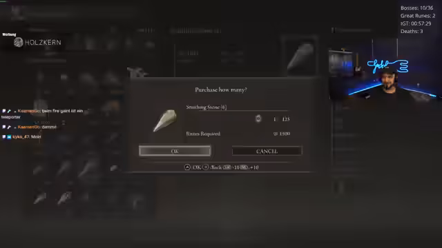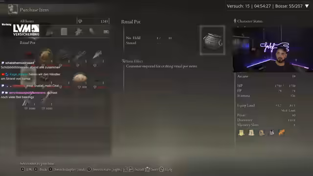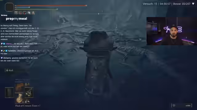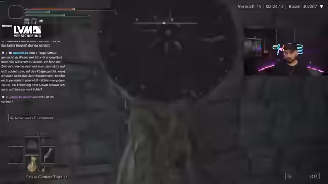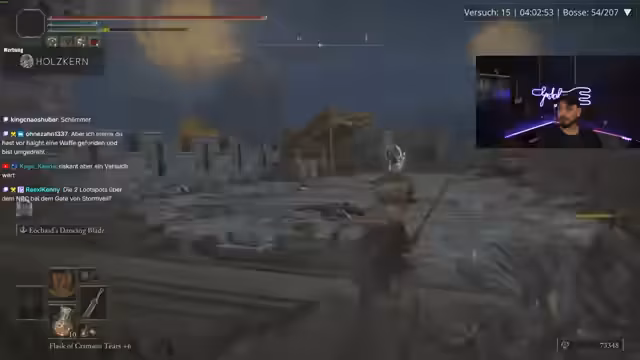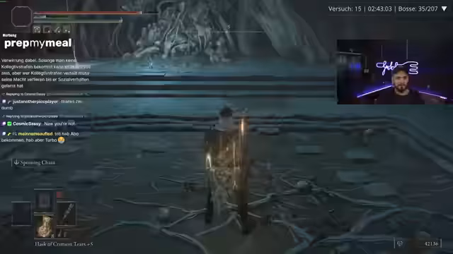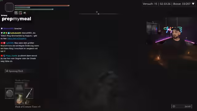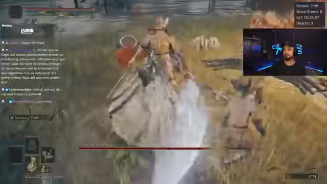 01:17:44Es wird eine Diskussion über die Effektivität von Waffen wie „White Socks“ und „Spinning Chain“ geführt, wobei „White Socks“ insgesamt als besser, „Spinning Chain“ jedoch als potenziell sehr stark eingeschätzt wird. Der Spieler bemerkt, dass er bereits 85.000 Runen gesammelt hat, was als „sehr sexy“ empfunden wird, und fragt sich, woher diese stammen. Es wird auch über die Schwierigkeit gesprochen, schnell mit bestimmten Charakteren zu interagieren, und die Notwendigkeit, einen Kampf erneut zu versuchen, da der bisherige Fortschritt nicht ausreicht. Die Integration des YouTube-Chats wird positiv hervorgehoben, da sie die Kommunikation zwischen den Zuschauern ermöglicht, obwohl der schlechte Talisman im Inventar bleibt. Ein Angriff, der den Spieler wütend macht, wird erwähnt, und die Hoffnung geäußert, dass zukünftige Kämpfe so gut wie die im DLC sind.
