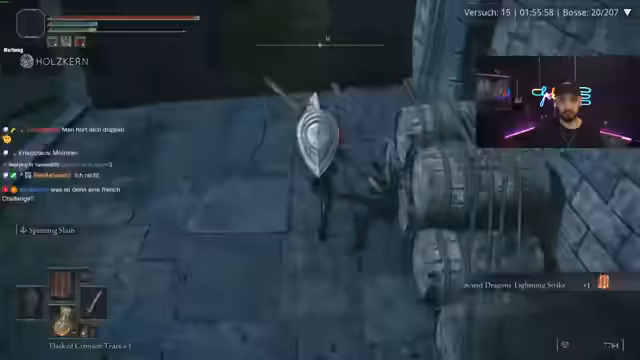 00:19:20Eine plötzliche Planänderung wird notwendig, da ein gefährlicher goldener Gegner den Weg blockiert. Dieser Gegner ist extrem stark und kann bei einem Treffer zum sofortigen Tod führen, weshalb ein Ausweichen unumgänglich ist. Es wird eine Erklärung zur 'French-Challenge' gegeben, die durch Eingabe eines Ausrufezeichens und des Wortes im Chat abgerufen werden kann. Eine Lieblingswaffe, die Eleonoras Stangenwaffe, wird gefunden, und es wird überlegt, ob sie im aktuellen Run behalten werden kann. Der Key für Volcano Manor wird ebenfalls entdeckt. Es wird diskutiert, ob Sekiro ein Soulslike ist, wobei die englischsprachige Community dies eher verneint, der Streamer es jedoch als das zweitbeste Soulslike nach Elden Ring ansieht.