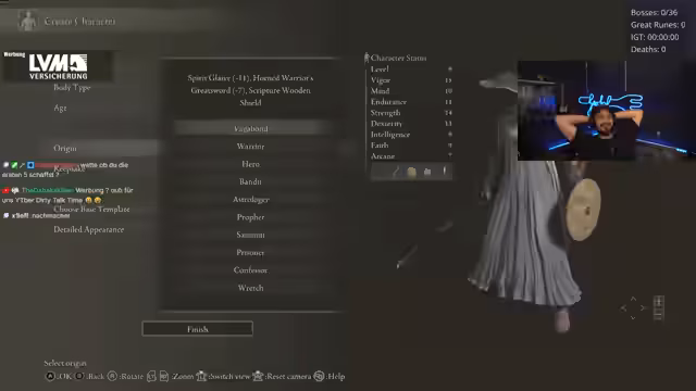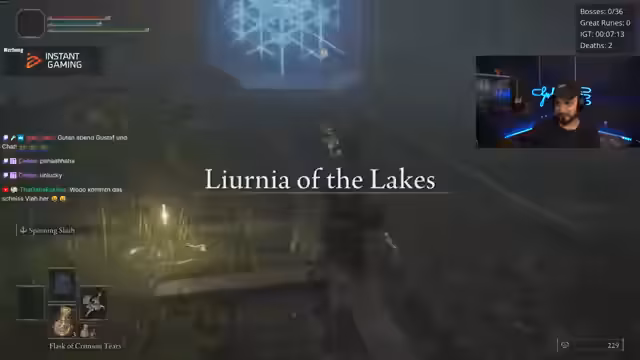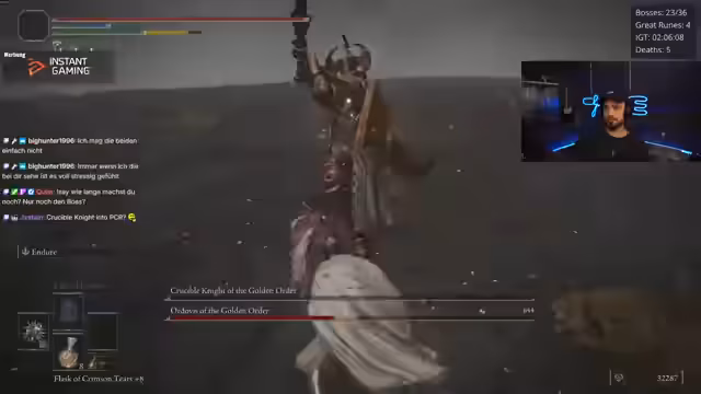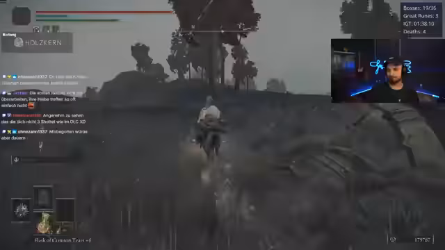 05:24:51Im Stream wird intensiv nach den großen Runen gesucht. Nach einem holprigen Start mit vielen Toden bei den Bossen scheint sich der Spieler zu stabilisieren. Es werden unterschiedliche Bosskämpfe gezeigt und analysiert, wie zum Beispiel gegen Godrix, was zu einem Duplikat führt, und Marlenia, wobei der Fokus auf Schadensoptimierung liegt. Spieler erkunden die Welt um Gracestellen und versuchen, alle benötigten Runen zusammenzutragen, was oft auf Umwegen geschieht und das Tempo des Streams bestimmt.