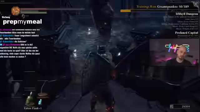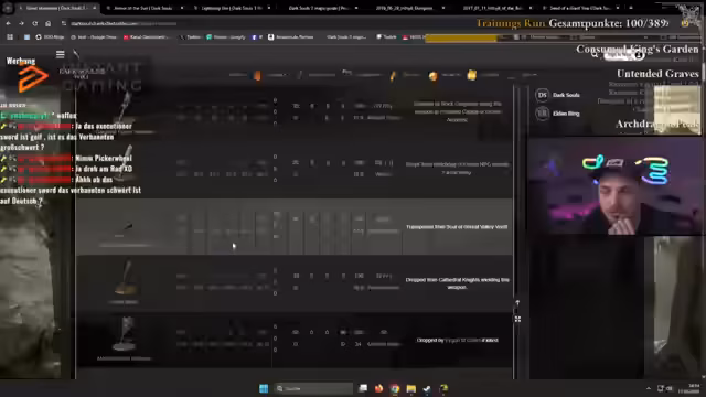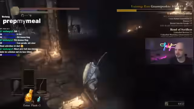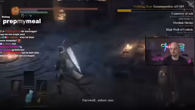 02:40:21Der Streamer reflektiere seinen bisherigen Fortschritt in der Generalprobe und vergleiche ihn mit dem geplanten offiziellen Run, der am Dienstag beginnen solle. Er erwähne, dass er viele kleinere Items wie Estus-Shards und Undead Bone Shards gesammelt habe, aber noch nicht alle relevanten Materialien für das Waffen-Upgrade hätte. Er fühle sich bereit für den echten Run, könne aber noch nicht sicher sein, wie gut die Generalprobe als Vorbereitung diene.