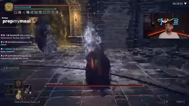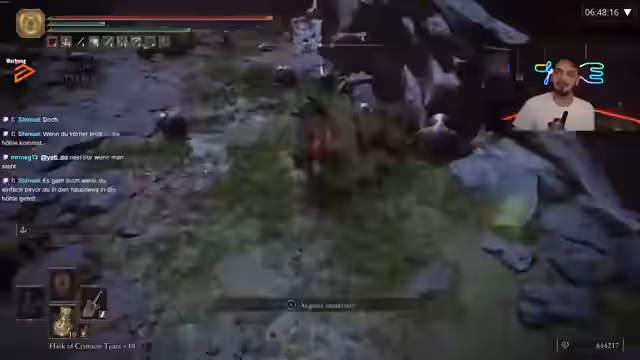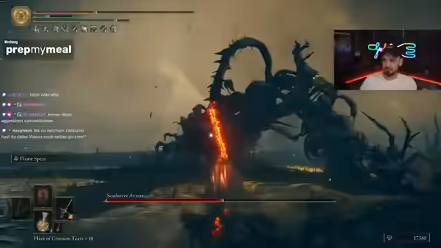 05:31:39Der Streamer setzt das Spiel fort und kämpft gegen einen Boss namens 'Crystallien', wobei er eine neue, sehr schadensstarke Waffe verwendet. Nach einem erfolgreichen Kampf zeigt er sich vom Output der Waffe beeindruckt. Er testet anschließend die Ash of War 'Flamespear' auf der neuen Waffe, stellt jedoch fest, dass diese im Feuer-Skaling abnimmt, was er als seltsam empfindet. Letztlich kommt er zu dem Schluss, dass es sich um eine coole Waffe mit einem interessanten, zweihändigen Moveset handelt, die ihn jedoch nicht unbedingt beeindruckt.