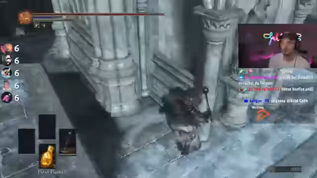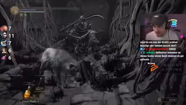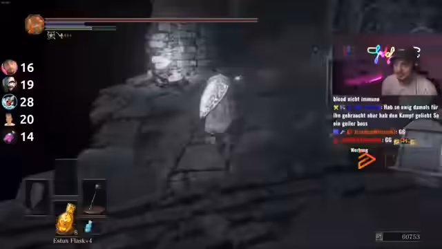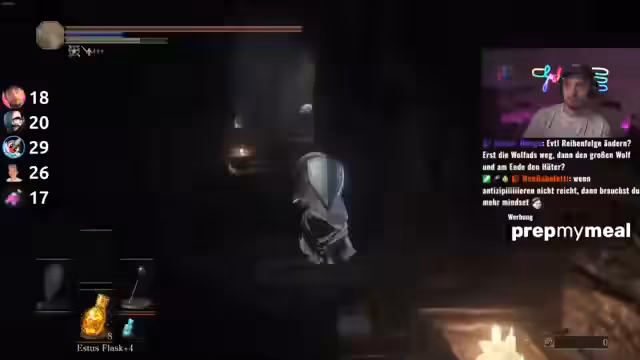 00:17:38Nachdem die technischen Schwierigkeiten überwunden scheinen, beginnt der Streamer mit dem Spiel. Er findet sich in der Anfangsarene wieder und stellt fest, dass die Items und Gegner zufällig generiert wurden, was die Unvorhersehbarkeit des Mod widerspiegelt. Sein erster Kampf gegen die Bossen Smough und Ornstein gestaltet sich jedoch äußerst schwierig. Er zeigt sich frustriert über seine eigenen geringen Kenntnisse im Spiel und den hohen Schaden der Bosse. Trotz des anfänglichen Scheiterns und mehrerer Tode erkennt er die Wichtigkeit der Ausweichmanöver und beginnt langsam, die Angriffsmuster der Bosse zu verstehen. Er diskutiert dabei mit dem Chat über die Taktik und gibt zu, dass er selbst im Souls-Genre noch viele Lernschritte vor sich hat.