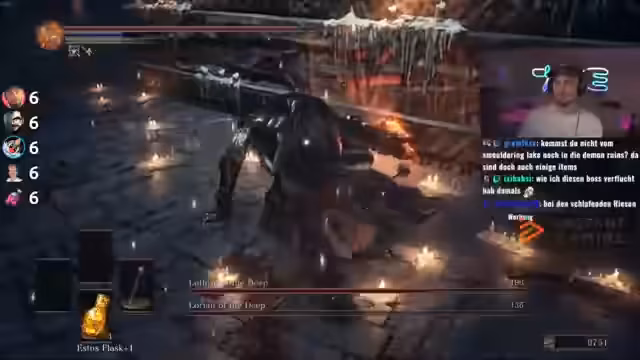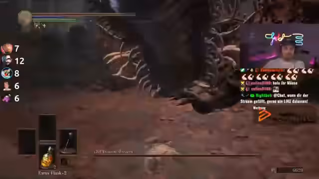 06:12:29Nach anfänglichem Suchen und Vorbereiten stößt der Streamer auf den Namenslosen König, einen bedeutenden Boss im Spiel. Der Kampf verläuft äußerst schwierig, der Streamer erleidet massive Schäden und wird mehrmals besiegt. Er diskutiert mit dem Chat über die richtige Taktik, versucht verschiedene Waffenaufwertungen und kämpft sich durch beide Phasen des Bosskampfes, bis dieser schließlich besiegt wird und ein Punkt im Randomizer gewonnen wird. Der Streamer äußert seine Freude über den Erfolg, nachdem er zuvor mit einer unterentwickelten Waffe zu kämpfen hatte.