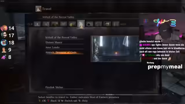07:56:11Während des Spiels ist der Streamer zunehmend verwirrt über die Spielwelt und die Wege, die er eingeschlagen hat. Er sucht unentwegt nach Foggates und vergisst oft, wie man zu bestimmten Orten wie zum Beispiel zum Sumpf oder zur Demon King Arena gelangt. Er fühlt sich im Kreis laufend und findet keine hilfreichen Hinweise im Chat. Seine Orientierungslosigkeit führt dazu, dass er wichtige Gebiete wie Lothric Castle verpasst und völlig das Gefühl verliert, wohin er als nächstes gehen sollte.