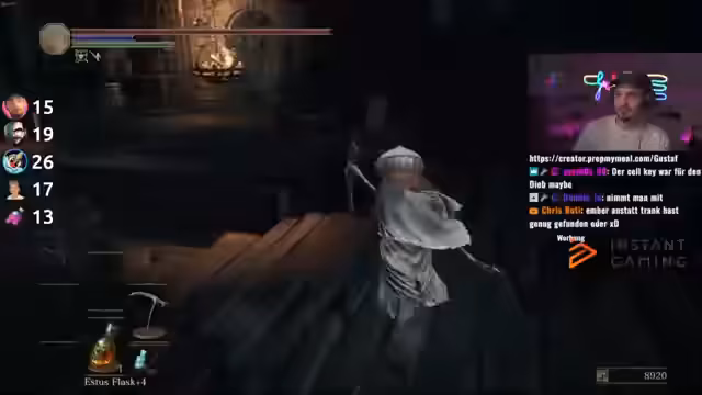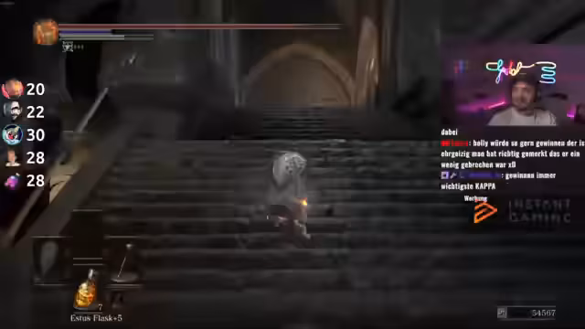 08:23:38Im weiteren Verlauf des Streams analysiert der Streamer seine eigene Performance und seine Kenntnisse des Spiels. Er gesteht, dass ihm die Orientierung in der Welt von Dark Souls 3 fehlt und er viel zu vergessen neigt. Er vergleicht das Spiel mit Elden Ring und findet, dass DS3 zwar linearer, aber nicht unbedingt einfacher ist. Obwohl er die DLCs gesehen hat, blickt er im Nachhinein auf seine vielen Fehlentscheidungen zurück und wünscht sich eine bessere Vorbereitung für zukünftige Runs.