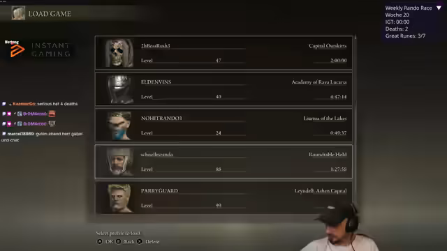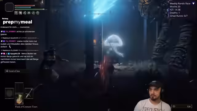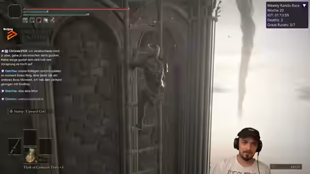 04:12:50Das Ziel des Rennens war es, schnellstmöglich die Hauptstadt zu erreichen. Dabei waren nur zwei Great Wounds als zwingende Sammelobjekte vorgegeben. Der Streamer beschloss, auf dem Weg zu diesen Punkten尽可能 viele Upgrades für seine Waffe zu sammeln und Geld zu looten, um seine Effizienz zu erhöhen. Die Strategie konzentrierte sich darauf, Bellbearings für das Upgrade zu finden und bei Händlern nach starken Waffen oder Upgrades zu suchen, was aber durch anfängliches Pech bei der Suche nach einem notwendigen Schmiedestein 1 behindert wurde.