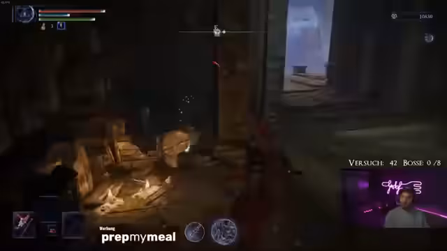 03:36:12Zurück im Spiel stellt Gustaf fest, dass seine Figur leise ist und er mit den Umstellungen vom spielen auf der Tastatur wieder Schwierigkeiten hat. Er experimentiert mit einem Build, der auf Rotblutung aufbaut und versucht, mit einem Grappling Hook agiler zu werden. Gleichzeitig bemerkt er, dass die Spielmechaniken wie das Sprinten sich anfühlen, als hätte er ein Paar Schuhe angezogen, nach dem er lange neue getragen hat.