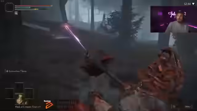02:53:36Nachdem er seine Waffe aufgewertet hat, wird das Spielverlauf wieder positiver. Er besiegt einen Drachen ('Dragonic Tree Sentinel') leicht und findet Elektro-Schaden, was sein Ziel ist. Der Streamer erwähnt, dass 'Rivers of Blood' stark ist, aber das größte Problem der FP-Verbrauch bleibt. Er findet einen 'Houndbolt' und freut sich über das Upgrade. Das Gameplay wird dynamischer und er scheint sich wieder wohler zu fühlen, nachdem er einen 'Drachen-Katana' gefunden hat.