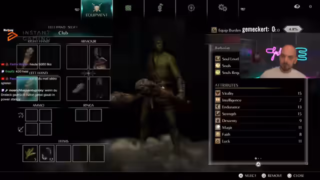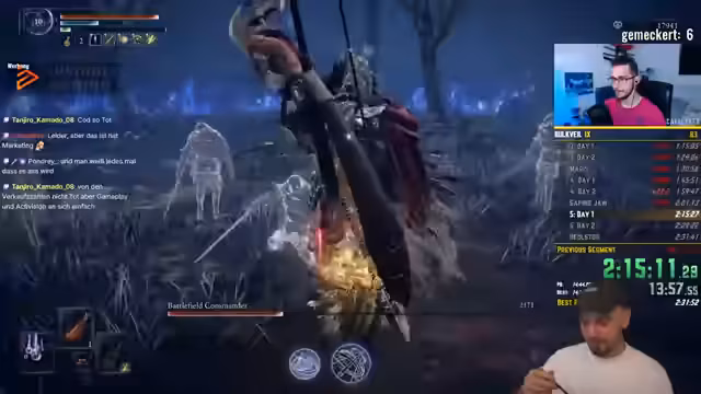 03:26:08Es wird überlegt, ob das Rollen im Spiel effektiv ist und welche Waffen man spielen kann. Der Streamer fühlt sich underlevelt, da er noch nie etwas eingelöst hat. Es wird überlegt, Patches zu töten und die Echse mit dem Ring zu besiegen. Der Streamer kämpft gegen Patches und andere Gegner, wobei er Schwierigkeiten hat, die Spielmechaniken zu verstehen. Er erhält Ratschläge aus dem Chat, die er jedoch aufgrund mangelnder Vorkenntnisse nicht immer nachvollziehen kann. Der Streamer irrt durch die Spielwelt und fragt sich, ob er wieder am Ausgangspunkt gelandet ist. Er überlegt, ob er den Boss machen muss. Es wird überlegt, ob man Seelen oder Steine farmen soll. Der Streamer hat Schwierigkeiten, den Kopf der Gegner anzuvisieren. Es wird überlegt, mit den gesammelten Seelen zu leveln. Das Inventar-Gewichtssystem wird als problematisch empfunden. Der Streamer versucht, den Gegnern auszuweichen, was ihm jedoch schwerfällt. Er wechselt die Rüstung, um mehr Feuerresistenz zu erhalten.
