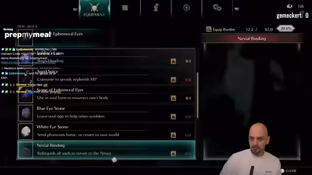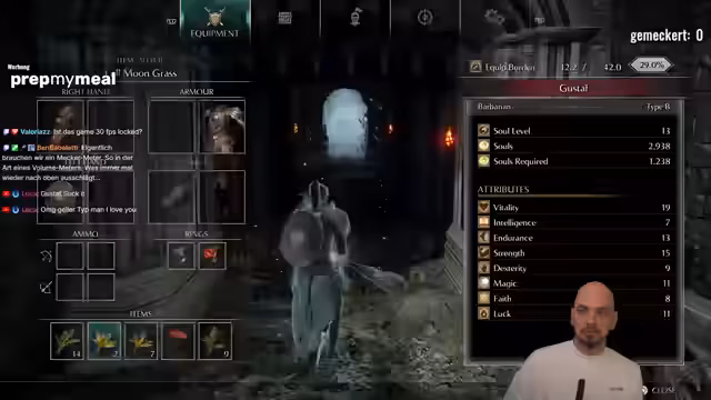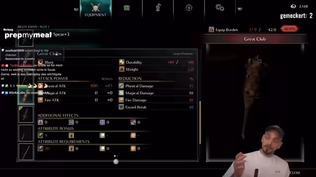 00:59:34Der Streamer stellt fest, dass er die gefundene Frauenkleidung aufgrund seines männlichen Charakters nicht tragen kann. Er sucht nach der Möglichkeit, seinen Charakter zu leveln, findet aber die entsprechende Option nicht. Er vermutet, dass er dies erst nach einem Bosskampf tun kann. Er überlegt, welche Attribute er verbessern soll und entscheidet sich zunächst für das Leben. Er versucht herauszufinden, was der Wert "Item Burden" bedeutet. Er ist unsicher, welche Waffe er verwenden soll und fragt den Chat um Rat. Er testet verschiedene Waffen und stellt fest, dass die horizontale Angriffsrichtung der gefundenen Waffe in diesem Spiel nicht optimal ist. Er erfährt, dass das Remake des Spiels nicht von FromSoftware, sondern von Bluepoint Games entwickelt wurde. Er nimmt die Waffe, die nicht kaputt ist. Er sucht nach Items und muss zu einem vorherigen Punkt zurückkehren.