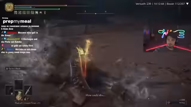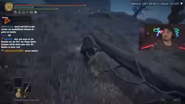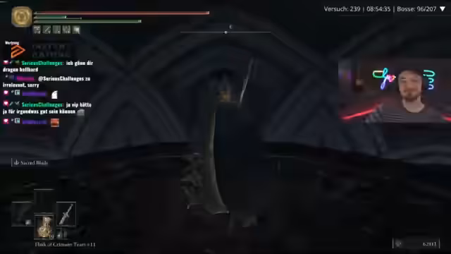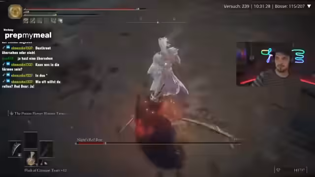 05:17:52Zu Beginn des Streamsabschnitts wird von einem verlorenen Kampf gegen Godric berichtet, der als 'Abwrack' beschrieben wird. Es wird erwähnt, dass Malenia in der First Strike-Plus-Variante mit 1,5 Geschwindigkeit keine Freude gemacht habe. Aufgrund mangelnden Schadens mit der aktuellen Waffe ist ein Wechsel zu den Lord's-Thorn-Schwertern nötig. Nach dem Bosskampf stellt der Streamer fest, dass der Waffenwechsel sich nicht gelohnt habe.