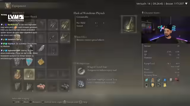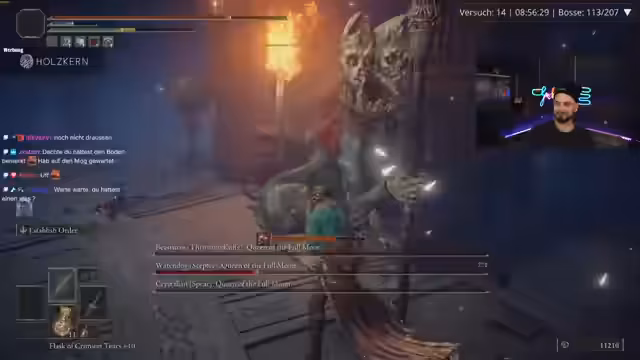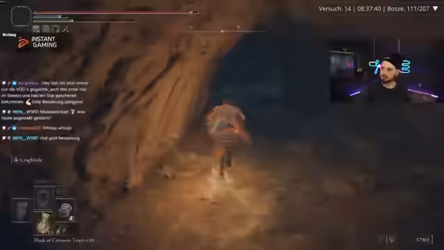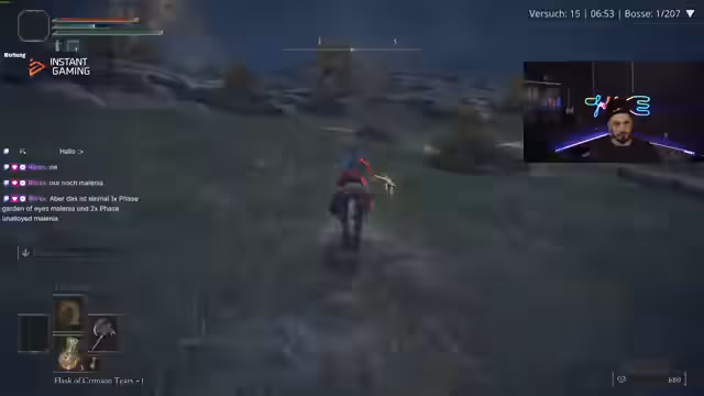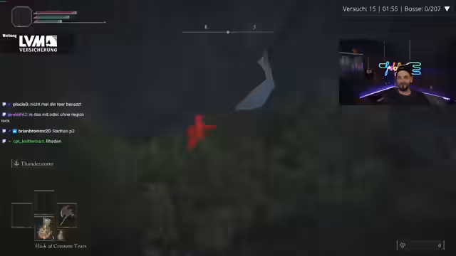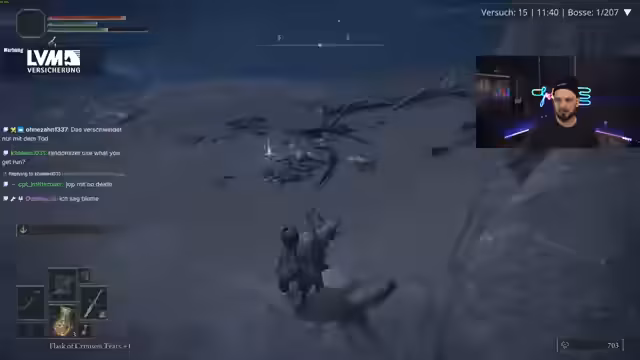 00:14:59Aufgrund seiner Geräuschempfindlichkeit und des Hörsturzes muss der Streamer seine ursprünglichen Pläne für den Stream ändern. Er wollte eigentlich einen "Hammer-Stream" machen, der eine Aufnahme erfordert hätte, fühlt sich aber nicht in der richtigen Verfassung dafür. Stattdessen entscheidet er sich, in Elden Ring die Einsel-Region zu erkunden, da Sjofra bereits abgeschlossen ist und Deep Root Death aufgrund eines fehlenden Gegenstands (Curse Mark of Death) nicht fortgesetzt werden kann. Er erwähnt, dass er als Selbstständiger unter Druck steht, arbeiten zu können, auch wenn er sich nicht gut fühlt, und dass er ein Gleichgewicht zwischen seiner Gesundheit und seiner Arbeit finden muss. Er reflektiert über die Herausforderungen der Selbstständigkeit und die Notwendigkeit, auf sich selbst zu achten, um langfristig weitermachen zu können.