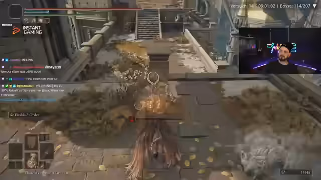 00:14:21Nach einer kurzen Pause wegen der Geräuschempfindlichkeit wird das Gameplay im Spiel 'Elden Ring' wieder aufgenommen. Das Ziel ist ein All-Boss-No-Death-Run. Der Streamer befindet sich im Consecrated Snowfield und kämpft sich durch gefährliche Gegner wie den Lianas Mist-Crusader und den Draconic Tree Sentinel. Der Fokus liegt darauf, wichtige Items wie den 'Mist-Crusader Greatsword' zu finden, während er gleichzeitig die gesundheitlichen Einschränkungen im Auge behält. Er stellt fest, dass selbst erfahrene Gegner wie 'Gargoyle Demi-Human Queen' ein großes Risiko darstellen.