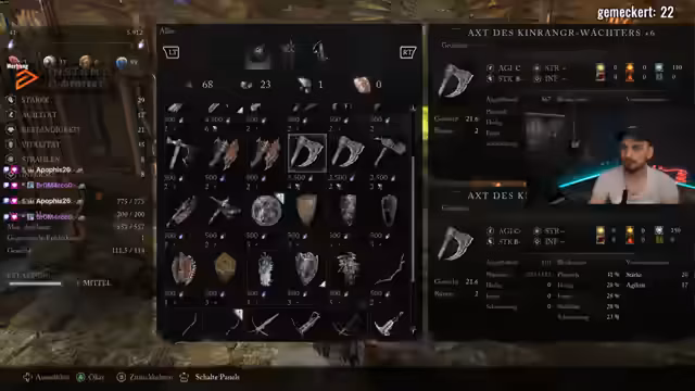 04:29:46Nach einem erfolgreichen Bosskampf, den er als solide bewertet, konzentriert sich der Streamer auf das Aufwerten seiner Waffen. Er experimentiert mit verschiedenen Materialien und Skalierungen, um seine Stärke zu erhöhen. Dabei wird er mit einem weiteren Boss konfrontiert, der ihn durch schnelle und heimliche Angriffe und einen Drachen unter Druck setzt, was ihn frustriert.
