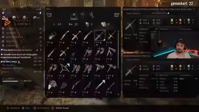 02:14:17Der Streamer erkundet ein umfangreiches Level-Design in Lords of the Fallen und stößt auf Frustration, da er Waffen nicht aufgewertet hat. Er experimentiert mit verschiedenen Waffen, entscheidet sich für eine schnellere Variante und ist begeistert vom verbesserten Schild. Die Spielmechanik, die Umbralwelt zu nutzen, wird als nützlich erachtet, auch wenn es an manchen Stellen anstrengend wird. Die Animationen und das Kampfgefühl der Waffen werden positiv bewertet.