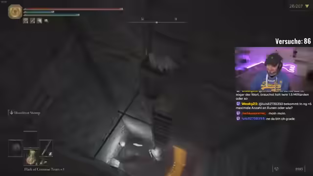 08:36:16Diskutiert wird eine Macher-Challenge, bei der es darum geht, einen Boss zu besiegen, ohne wegzulaufen und idealerweise mit Gift. Es wird über die Schwierigkeit und die anzuwendenden Taktiken gesprochen, einschließlich des Einsatzes von 'Deadly Poison'. Die Effektivität verschiedener Waffen und Statuseffekte, wie Frost, werden erörtert. Es wird erwähnt, dass der Coil Shield eine besonders gute Waffe sei, vor allem, weil sie 'Deadly Poison' verursacht. Ein Zuschauer fragt nach der Anzahl der Runen, die man für Level 300 benötigt, was zu allgemeiner Verwirrung führt. Es wird kurz auf die Möglichkeit eingegangen, nach dem Besiegen eines Bosses von einer bestimmten Stelle herunterzuspringen. Die Schwierigkeit des Bell-Bosses wird relativiert, wenn man seine Angriffsmuster kennt, insbesondere im Kontext von Randomizern, die bestimmte Attacken entfernen können. Abschließend wird überlegt, ob man das DLC 'Renderways' spielen soll, wobei der Streamer es von der Möglichkeit abhängig macht, mit einer Freundin zu spielen.