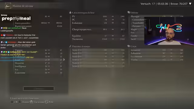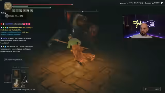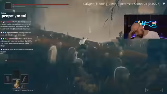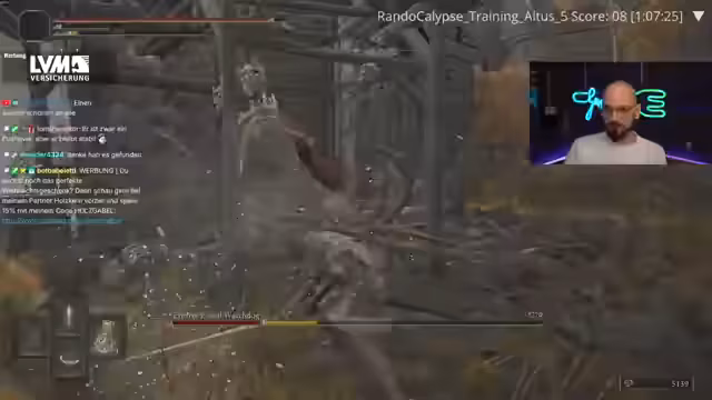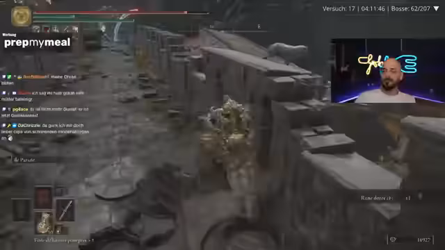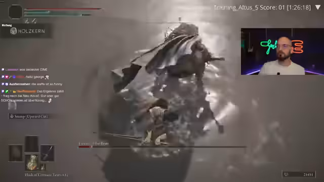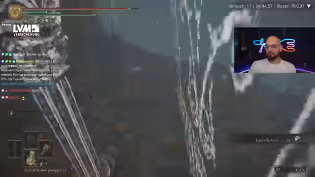 03:55:42Der Streamer kämpft mit einer Katze, die sich in der Wand befindet und ihn in andere Gegner drängt, die er nicht gesehen hat. Er ist frustriert über die Unmöglichkeit, den Kampf zu gewinnen, und stellt fest, dass er den 'Repost' nicht nehmen konnte, weil der Gegner entweder in der Wand oder im Boden steckte. Er zählt acht Tode und fühlt sich körperlich und mental erschöpft. Er überlegt, welche Bosse er in 'Altus' ausgelassen hat, darunter 'Lanzerks' und einen anderen DLC-NPC. Er gesteht ein, dass es schwierig ist, in solchen Situationen motiviert und positiv zu bleiben, da Sterben im Spiel hart bestraft wird.