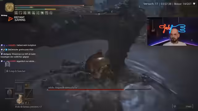 02:33:51Der Streamer ist frustriert über seine wiederholten Niederlagen und das Gefühl, trotz vieler Spielstunden nichts zu erreichen. Er reflektiert über die Schwierigkeit, gegen den Blackknife Assassin zu kämpfen, und fragt sich, wie andere Spieler damit umgehen. Er setzt sich das Ziel, einmal nicht zu sterben, und betrachtet dies als seinen derzeitigen Wunsch. Er diskutiert verschiedene Waffen und Kampfstile, wie 'Palm Blast' und 'Dain's Footwork', und überlegt, welche Bosse er zuerst angehen sollte. Er ist salzig über seine bisherigen Turnierleistungen, da es ihm noch nicht gelungen ist, gut zu spielen, erinnert sich aber daran, dass Training nicht perfekt sein muss. Er versucht, Bosse in eine Schleife zu bringen, um sie einfacher zu besiegen.