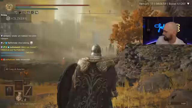 04:07:59Der Streamer hat manchmal Probleme, Gegner zu sehen, da seine Waffe zu groß ist. Er erklärt die Punktvergabe des Turniers: pro Boss ein Punkt, pro Tod ein Minuspunkt, was das Sterben extrem bestraft. Man startet immer in einem bestimmten Gebiet und darf in einfacheren Gebieten keine Punkte verdienen. Er gibt ein Beispiel, dass er, wenn er in 'Leonia' startet, keine Punkte in 'Limgrave' verdienen kann. Er erwähnt, dass 'Sage's Cave' eine gute Option ist, wenn man beide Bosse hintereinander besiegen kann, und dass nur Bosse mit einer Bossleiste Punkte geben, außer zwei, die verschwinden.