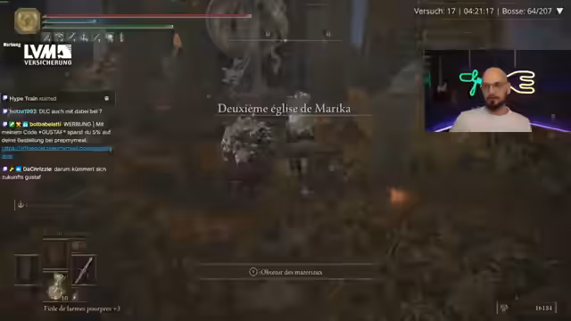 02:47:36Der Streamer entscheidet sich, sich von einem Kampf zu lösen, ohne zu sterben, und akzeptiert die Situation, um weiterzumachen. Er ist sich unsicher, ob er zu diesem Boss zurückkehren würde. Er begegnet einem Gegner, den man 'einfach nicht macht', und verliert dadurch Zeit. Er ist frustriert über die mangelnden Lösungen und das Gefühl, dass es keine richtige Strategie gibt. Er versucht, ruhig zu bleiben, obwohl er wütend ist. Er überlegt, ob er einen bestimmten Weg hochlaufen sollte, um goldene Saaten zu sammeln, die ihm eine gute Waffe garantieren könnten. Er begegnet einem DLC-NPC mit einer schrecklichen Waffe und muss seinen Plan ändern, da seine Verteidigung im Minusbereich ist.