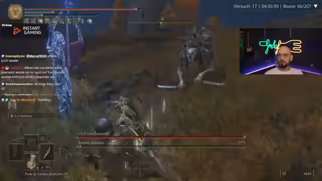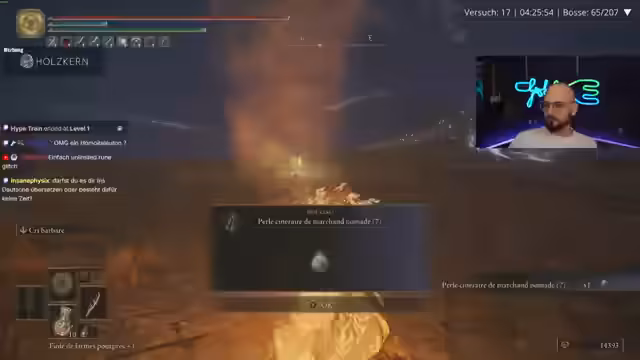 02:57:04Der Streamer ist verwirrt, aber nicht unzufrieden mit dem Fortschritt. Er überlegt, ob er einen bestimmten Boss bekämpfen soll, der zwei Minuten bis zum Erreichen benötigt. Er erhält 'Impaling Frost' auf seiner Waffe, erkennt aber, dass die Bosse in der Gegend ebenfalls Probleme bereiten. Er warnt davor, zufällige Items aufzuheben, da dies in dieser Challenge sehr gefährlich sein kann. Er muss nicht warten, bis es Nacht ist, um mit einem NPC zu reden, und erhält eine zusätzliche Flask. Er ist frustriert über die lange Waffe, die nicht richtig funktioniert, und die fehlende Ausdauer. Er findet eine sehr gute Waffe, die 'Gargles Blackblades', und ist zufrieden mit einem bestimmten Kampf.