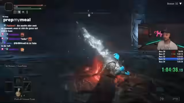 03:45:51Während des Streams kämpft der Streamer gegen verschiedene Bosse wie Malenia und Rakshasa, wobei er einige Male stirbt und wertvolle Zeit verliert. Er äußert Frustration über die Länge mancher Kämpfe und das Fehlen von Heilungstränken, was die Runs zusätzlich erschwert. Gleichzeitig bleibt er motiviert und betont, dass jeder Run anders und zufällig ist.