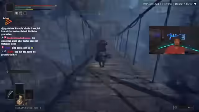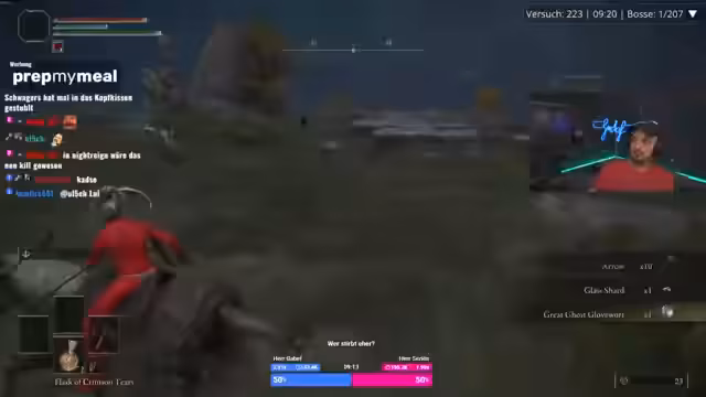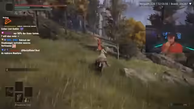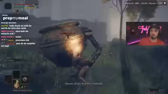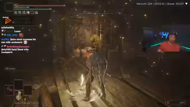 05:08:06Die Streamer erreichen den gefährlichsten Teil von Limgrave, die Impaler-Catacombs, und bereiten sich auf einen als sehr schlimm beschriebenen Bosskampf vor. Sie stellen fest, dass die Arena extrem anstrengend ist, da Gegner nach der Niederstellung sofort wieder aufstehen. Während des Kampfes müssen sie massive Probleme mit der Kameraperspektive und der KI des Bosses, der sich im Schatten versteckt, feststellen. Der Kampf endet mit knapper Not, wird aber als einer der schwierigsten Runs im bisherigen Spielverlauf bezeichnet.
