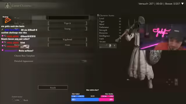 04:19:51Zu Beginn des Stream-Ausschnitts wird eine beendete Wette thematisiert, bei der es um viel Geld ging. Die Streamer analysieren ihren Spielstand, der sich seit dem letzten Run deutlich verbessert hat. Sie diskutieren ihre aktuelle Ausrüstung, wie zum Beispiel die Anzahl an Heiltränken und den gegenseitigen Seed, der es ermöglicht, denselben Run zu spielen und zu vergleichen. Eine zentrale strategische Frage ist, welche Attacken man gegen einen Boss wie den Avatar of God einsetzen sollte, um zu verhindern, dass dieser neun bis zehnmal hintereinander die gleiche Attacke ausführt.