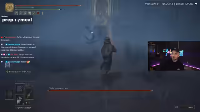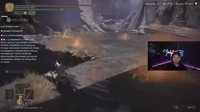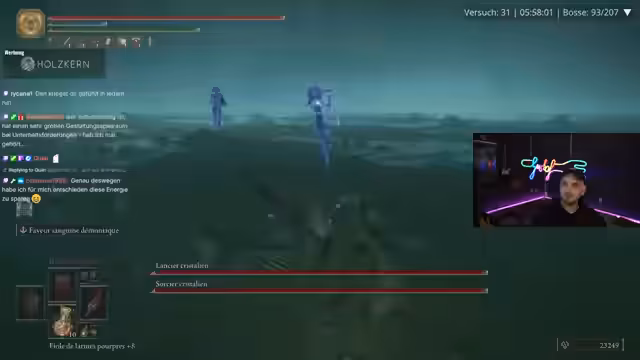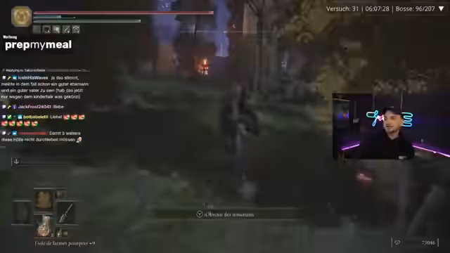 03:23:34Der Streamer berichtet von einem gefährlichen Moment, bei dem er durch den Holy Schaden der aktuellen Waffe und die Spielmechanik beinahe gestorben wäre. Er erklärt, dass es ihm an Ausweichmöglichkeiten mangelt und er sich in diesem Spielabschnitt unsicher fühlt. Um die Situation zu verbessern, will er versuchen, den problematischen Helm zu ersetzen, der sehr viel Leben kostet. Er unterhält sich mit dem Chat über den Schaden und die Vor- und Nachteile der aktuellen Ausrüstung.