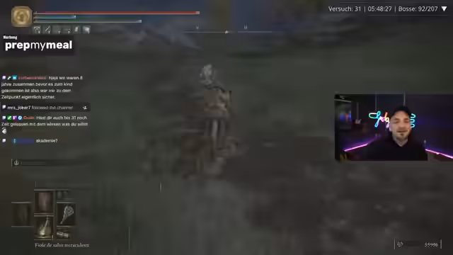04:28:28Der Streamer stellt fest, dass er einen bedeutenden Boss besiegt hat, was ihm große Freude bereitet. Er erwähnt, dass er das Gefühl hat, auf dem richtigen Weg zu sein, und freut sich über die Fortschritte im Spiel. Allerdings kann er aufgrund technischer Probleme mit 'Steam Elements' nicht weitermachen und wartet auf eine Lösung. Er nutzt die Zeit, um mit dem Chat zu interagieren und seine Strategie für den nächsten Spielabschnitt zu überlegen.