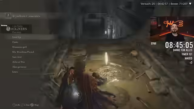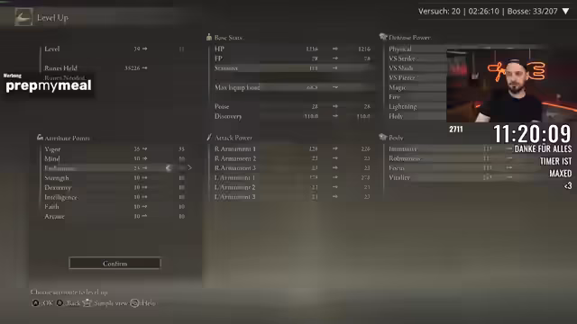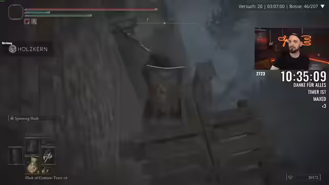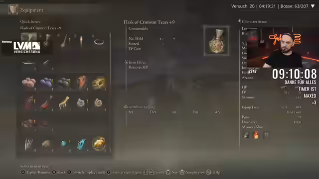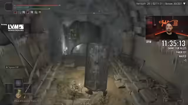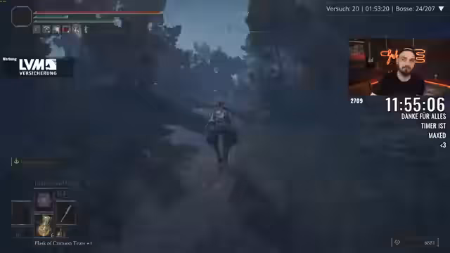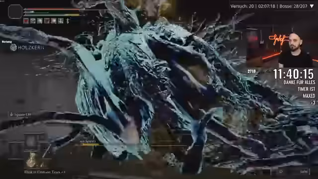 00:01:46Der Streamer berichtet über seine Fortschritte im Spiel, insbesondere über den Versuch, die Ausrüstung zu verbessern, was jedoch durch einen sehr hohen Gewichtswert erschwert wird. Charakter und Ausrüstung wiegen fast das Maximum, was die Kämpfe erheblich erschwert. Trotzdem gelingt es dem Streamer, mehrere Bosse zu besiegen, darunter die Crucible Duo und Odovis. Er erwähnt, dass er die Kämpfe mit dem Minimum an Flaschen und dem niedrigsten Aufwertungslevel bestreiten musste, was den Run als besonders herausfordernd beschreibt. Er ist jedoch erleichtert, dass er mit seiner Waffe und den gefundenen Items Erfolge erzielen kann.