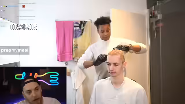 05:40:39Nach dem Auswaschen der Farbe bemerken sie, dass die Einweg-Handschuhe fehlen. Glücklicherweise finden sie im Karton Ersatz. Der Streamer stellt fest, dass er beim Färben nicht alle Haare vollständig erwischt hat, während Niki eine sehr gleichmäßige Färbung erreicht hat. Nach dem Trocknen stellt er fest, dass seine Haare blond geworden sind, aber nicht einheitlich, und die Konsistenz wie Watte ist. Währenddessen kämpft er mit technischen Problemen, da sich die Kamera nicht richtig justieren lässt und das Bild unscharf erscheint. Er versucht, dies zu korrigieren, um das finale Endergebnis besser zeigen zu können.