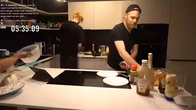 07:15:42Eine weitere entspannte Aktivität im Stream war das gemeinsame Zubereiten von Burgern durch den Streamer und seine Gäste. Der Streamer übernahm dabei die Zubereitung des Hackfleischs während sich die anderen um das Braten der Brötchen und das Anrichten der Zutaten wie Käse und Salat kümmerten. Es wurde über die Wahl der Zutaten, insbesondere des Käses, diskutiert und das Ergebnis als professionell gelungen angesehen. Diese Aktivität diente als lockere und gesellige Ablenkung vom Hauptgeschehen rund um das Färben der Haare und das Spielen von Arc Raiders.