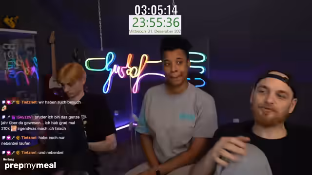 10:00:09Der Countdown zum neuen Jahr läuft, doch das Feuerwerk entzündet sich nicht wie geplant und fällt schließlich sehr spät und laut aus. Das Erlebnis wird als 'beeindruckend' und 'voll geil' beschrieben. Der Streamer kündigt an, für die nächsten Tage offline zu gehen und bedankt sich bei seinem Chat für die mitgebrachte Freude und die Begleitung im vergangenen Jahr.