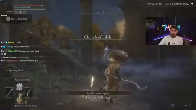 06:12:43Der Streamer beginnt eine neue Elden Ring-Runde, die als neunter Versuch in der French Challenge gilt. Er freut sich auf die Entspannung, die Elden Ring ihm bietet, da es ein Spiel ist, das er gut beherrscht. Ein besonderer Fokus liegt auf der Charaktererstellung, bei der er versucht, den Charakter 'Handsome Thaddeus' nachzubilden. Dies beinhaltet detaillierte Anpassungen von Augenbrauen, Nase, Lippen und Hautfarbe, um dem Vorbild möglichst nahe zu kommen. Während des Spiels wird eine Waffe namens 'Flambeersch' gefunden, die Holy-Damage verursacht, obwohl sie brennend aussieht. Er plant, diese Waffe zu nutzen, um die frühen Bosse zu besiegen und hofft auf weitere Upgrade-Materialien wie Dunkelschmiedesteine, um die Waffe zu verbessern. Die U-Weg-Regeln besagen, dass alle leicht erreichbaren Gegenstände gesammelt werden müssen, solange das eigene Leben nicht gefährdet wird.