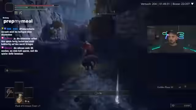 00:16:39Im Gameplay von Elden Ring kämpft der Streamer erfolgreich gegen mehrere Bosse im Limgrave. Er nutzt die Flambert-Waffe mit effektivem Blitzschaden und vermeidet Schaden durch Ausweichen. Nach einem Sieg gegen einen Boss, der als 'Kackboss' beschrieben wird, findet er wertvollen Loot, darunter eine goldene Saat und einen Drachenkrieger-Schild, seine Verteidigung signifikant verbessert. Er trifft die strategische Entscheidung, zunächst zu looten, anstatt direkt den nächsten, schwierigen Boss zu bekämpfen.
