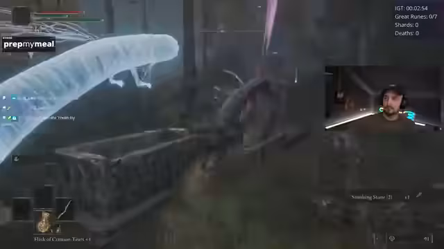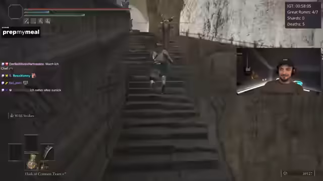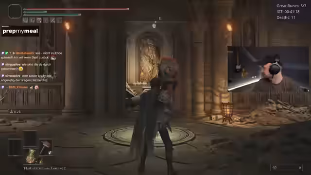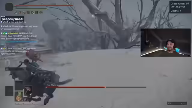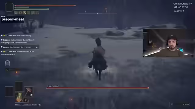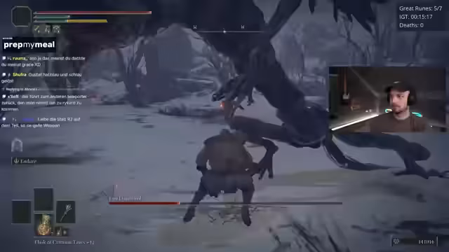 01:38:58Ein bemerkenswertes Ereignis ist der plötzliche und unvorhergesehene Tod des Fire Giant, der wortwörtlich in die Luft fliegt, nachdem ihm nur noch 5% Leben blieben. Der Streamer ist baff von diesem seltenen und nicht reproduzierbaren Bug. Danach kämpft er gegen den Godskin Duo Boss, der sich als extrem frustrierend erweist, da er in der Arena nicht richtig funktioniert, Hyper-Armor hat und dem Streamer kaum eine Chance lässt. Er beschreibt den Kampf als komplette Katastrophe.