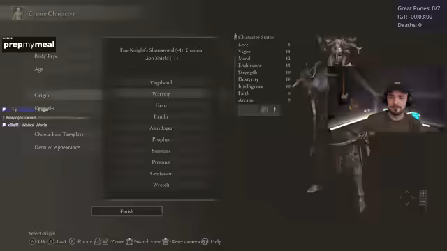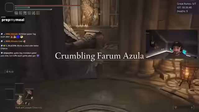 00:06:29Der Stream beginnt mit guter Laune Musik. Gustaf begrüßt das Publikum und gibt erste Einblicke in den geplanten Ablauf. Die Teilnehmer, unter anderem Chad und Epi, bereiten sich auf die Rando Races vor. Ein neues Intro wird gezeigt, was die Begeisterung weckt. Die grundlegenden Regeln des Formats werden erklärt: man startet mit 100.000 Ruhlen, erhält ein Care-Package mit Items und Waffen und sammelt Great Runes in einer festgelegten Reihenfolge, um zum Endboss zu gelangen.