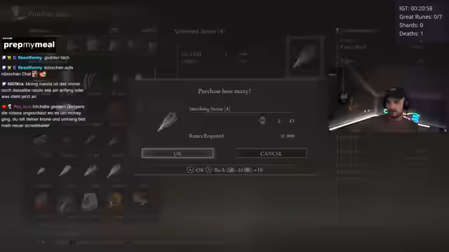 02:22:14Ein zentrales Problem des Streams ist der Mangel an Gold und Upgrades. Der Streamer hat kaum Goldene Runen und kaum Geld, um Waffen aufzuwerten. Er überlegt, ob er für eine bestimmte Waffe wie Zomber (Death Poker) Geld ausgeben soll, aber es ist für ihn unklar, ob sich das lohnt. Sein Gegner, Alex, scheint bessere Drops zu haben. Der Streamer erkundet verschiedene Wege, um schnell an Geld oder Upgrades zu kommen, und ist über die schlechten Drops frustriert, auch wenn er immerhin Milicents Prophezeiung gefunden hat.