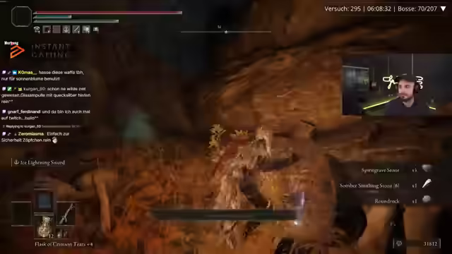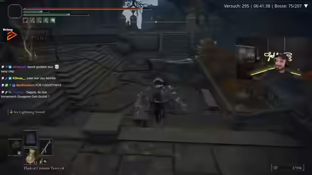 03:12:00Der Streamer erkundet die Overworld und stellt fest, dass es doch nicht so einfach ist wie gedacht. Es wird über den Schaden diskutiert, den man auf den Kopf verursachen kann. Der Streamer bemerkt, dass er zu viel Zeug dabei hat und der Schaden dadurch nicht optimal ist. Es folgt ein einfacher Kampf, bei dem der Streamer wartet, bis seine Stamina wieder da ist. Anschließend wird über Lieblingsschwerter und Waffen gesprochen, wobei das Alabaster Lordshorn als eine der Lieblingswaffen genannt wird. Der Streamer plant, seine Holy-Waffe zu nutzen und Waffen wegzutun, die er nicht mehr benötigt. Er entscheidet sich gegen eine Waffe und plant, Great Stars mit Shared Order zu verwenden. Der Streamer überlegt, seine Skillpunkte neu zu verteilen, um Faith besser zu nutzen, und plant, 20 Dex und mindestens 20 Stärke zu investieren.