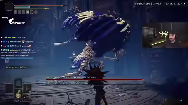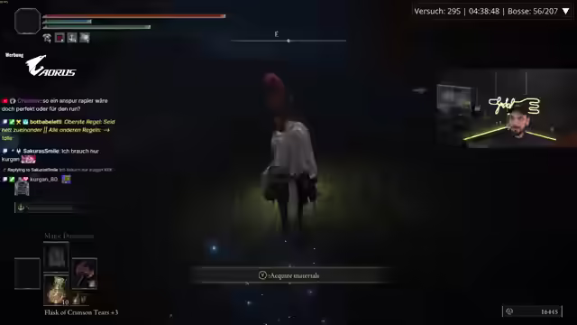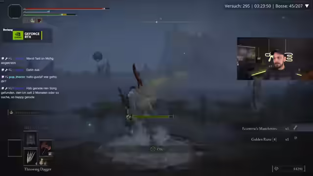 00:07:47Der Stream beginnt mit Gustav Redef, der sich auf ein Elden Ring-Abenteuer vorbereitet und dabei seinen Unmut über diverse körperliche Beschwerden äußert. Er startet in Leonia, einem Gebiet, das er bereits zur Hälfte erkundet hat, und setzt sich das Ziel, 52 gefährliche Bosse in einer speziellen Challenge zu besiegen. Dabei legt er Wert auf den Spaß am Spiel und die damit verbundene Herausforderung. Er spricht über seine Freude am Autofahren und den Besuch des neuen Demon Slayer Films im Kino. Im Spiel konzentriert er sich auf das Sammeln von Items und die Wahl der richtigen Waffen, wobei er zwischen einer Waffe mit Rot- und Gift-Effekt und einem Dragon Skill Katana abwägt. Er diskutiert mit dem Chat über die Effektivität verschiedener Waffen und Strategien, insbesondere im Hinblick auf den Kampf gegen bestimmte Bosse und die Bedeutung von Runen.
