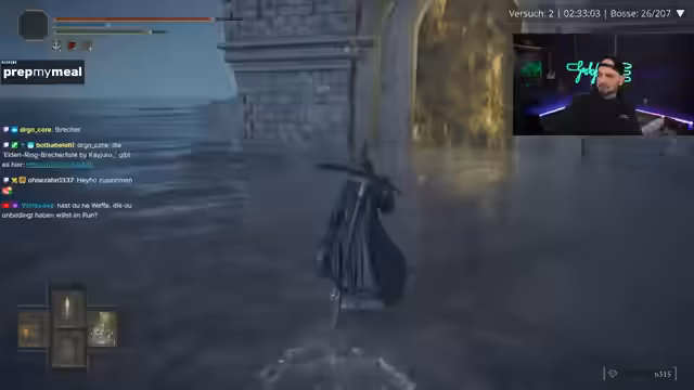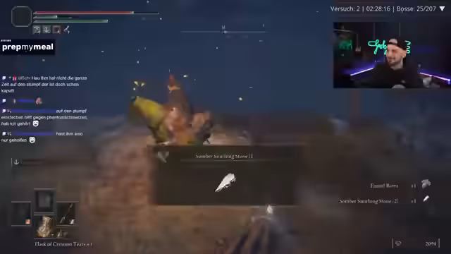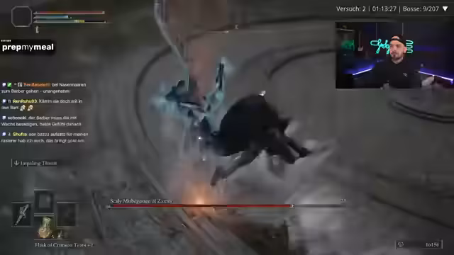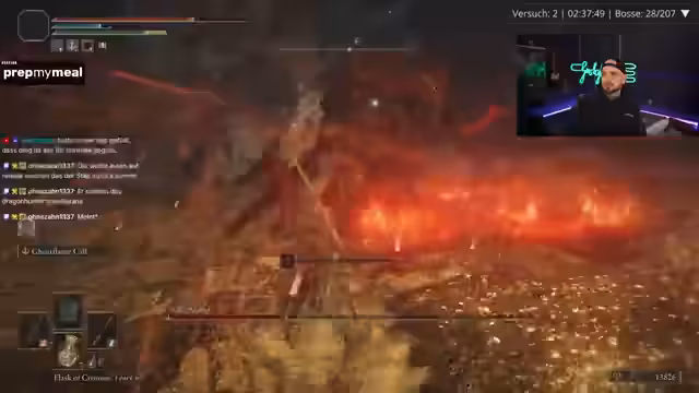 00:58:05Während der Challenge kämpft der Streamer gegen verschiedene Bosse und Gegner. Er kämpft sich durch "Malika's Glintstone" und trifft auf den Brecher-Gegner, der als besonders nervig beschrieben wird. Nach einem Kampf, der als "Vollkatastrophe" und "schrecklich" bezeichnet wird, tötet er einen DLC-Gegner. Anschließend wechselt er die Ausrüstung und setzt die Ash of War "Flame Arts" ein, um seinen Schaden zu erhöhen.