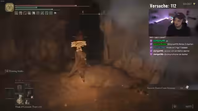 03:45:18Zu Beginn des Streams konzentriert sich der Streamer auf die Spielfortschritte im Spiel 'Elden Ring'. Er kämpft gegen verschiedene Gegner und Bossgegner wie den Fire Giant und Gaius. Die Kämpfe gestalten sich oft langwierig und anspruchsvoll, da der Streamer mit der aktuellen Ausrüstung nur begrenzten Schaden anrichtet. Er bemängelt, dass er bisher keine starken Waffen im Randomizer-Modus gefunden hat, was die Kämpfe erheblich erschwert.