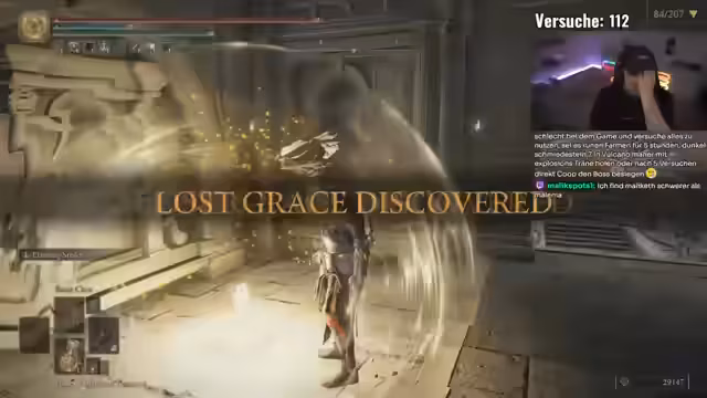 02:01:46Der Streamer betritt einen DLC-Bereich und konfrontiert neue, stärkere Gegner. Die Kämpfe werden deutlich härter und länger, was zu Frustration führt. Er stellt fest, dass er in diesen neuen Gebieten keinen Keller (Grace) hat und sich mit dem unübersichtlichen Gelände und den übermächtigen Angriffen der Gegner herumschlagen muss. Er kämpft mit Problemen wie geringer Ausdauer und Schadensresistenzen der Bosse, was die bereits anspruchsvollen Kämpfe noch schwieriger macht.