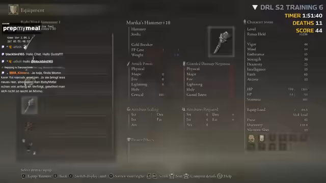 01:00:38Nach einigen Testläufen wird die gewählte Waffe, Lineslaw, ausführlich analysiert. Ihre Stärken, wie der Ignorieren-Angriff L2 und hohes Leben, werden gelobt, aber auch Schwächen wie hoher Mana-Verbrauch werden diskutiert. Es wird über den Einsatz einer Zweitwaffe wie Marikas Hammer nachgedacht, um verschiedene Schadensarten abzudecken. Der Streamer vergleicht die Performance mit anderen Waffen und stellt fest, dass die aktuelle Kombination für schnelle Kämpfe in den frühen Spielgebieten ideal ist, aber für die geplante High-Level-Routen weiter optimiert werden muss.