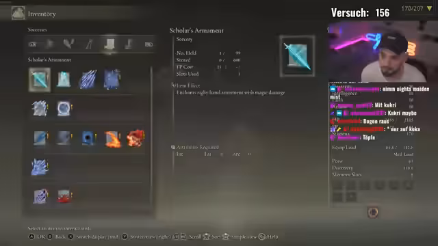 00:07:52Es gibt technische Schwierigkeiten mit Caster Labs, was ein Update oder eine Neuinstallation erfordert. Dies beeinträchtigt die Chat-Anzeige im Stream. Trotz der anfänglichen Probleme mit der Software und der Chat-Funktionalität, wird der Run fortgesetzt. Es wird betont, dass es sich um einen No-Death-Run handelt, was den Schwierigkeitsgrad erhöht. Aktuell sind 148 von 207 Bossen besiegt, was als sehr gut bewertet wird. Die aktive Rune ist Radans große Rune. Die Hauptschadensquelle ist ein Cold Grade Katana und Lightning Rotten Batlambler mit Lightning Slash. Black Knife wird für anfänglichen Schaden genutzt. Defensiven Talismane sind vorhanden, jedoch fehlen offensive. In der Flasche befinden sich Magic Shrouding Cracktear und Lightning Shrouding Cracktear für die entsprechenden Schadensarten. Fast alle Gebiete sind abgeschlossen, bis auf Farmazula, Consecrated Snowfield und Endgame Ashen Capital. Der nächste Gegner ist Lamenta, vor dem großen Respekt besteht, da er mit purem Schaden bekämpft werden muss.